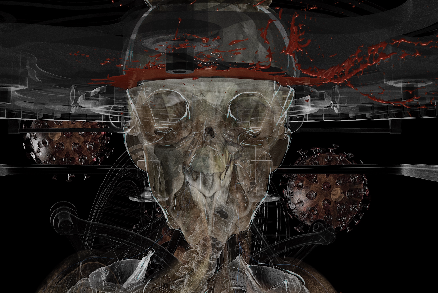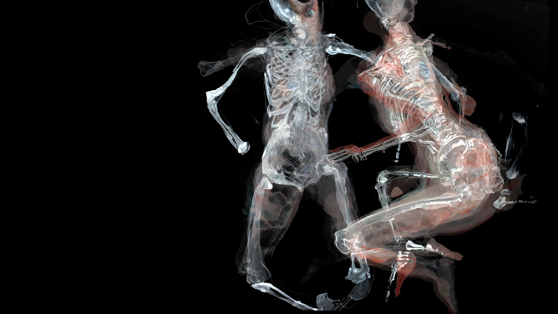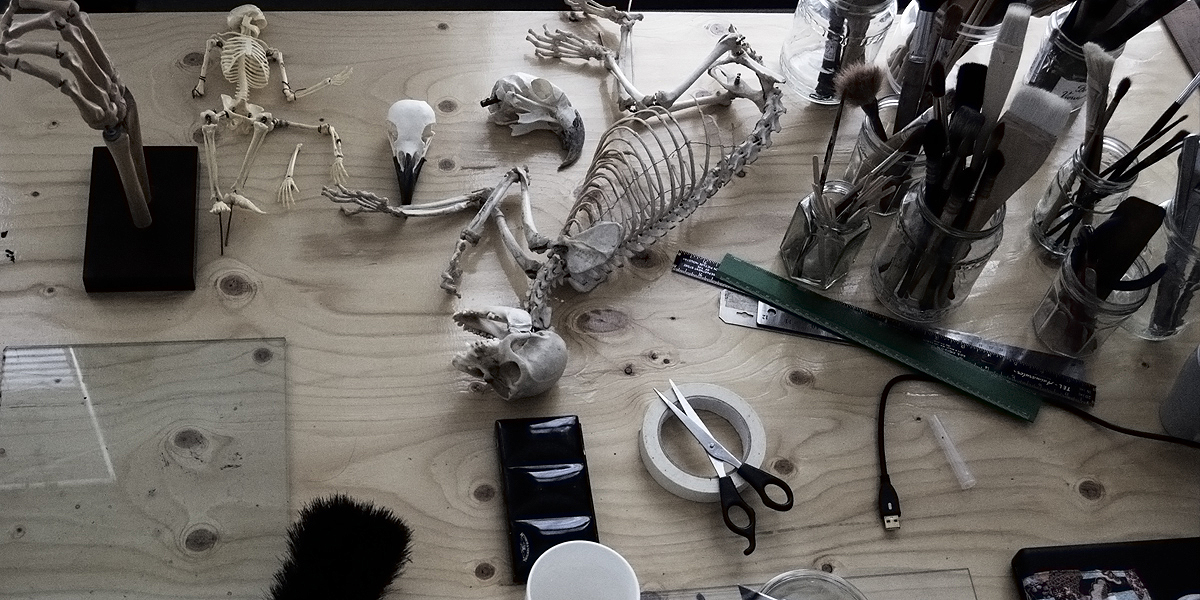 The digital puppets of FRANKENSTEIN'S DREAM are created by wrapping layers of watercolour drawings - made of blood, bone-black, ivory, and sundry other pigments, onto 3D CGI skeletons and digital scans of real human and animal skulls.