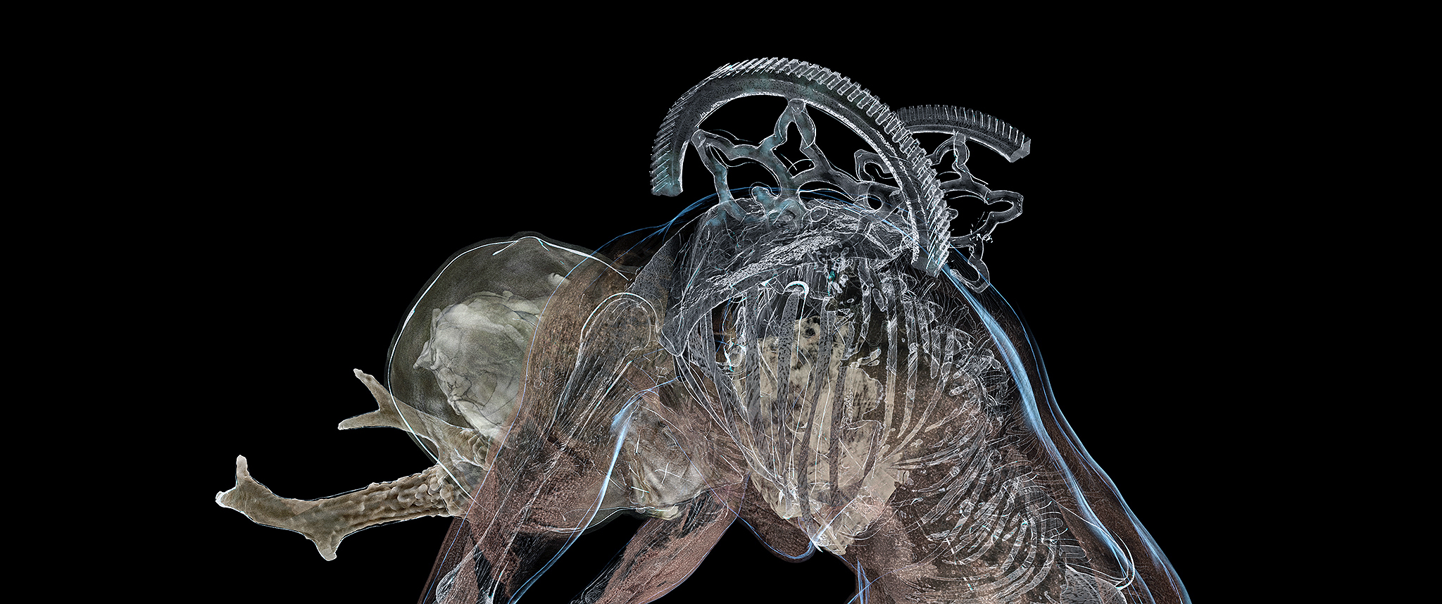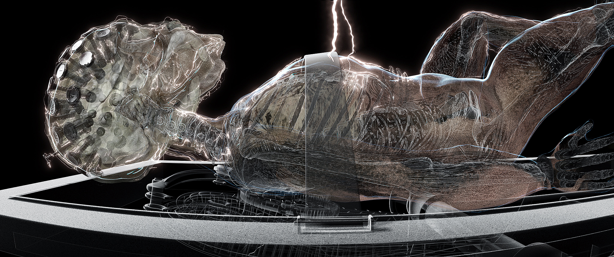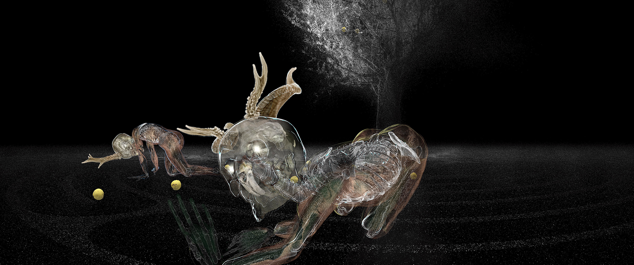 The digital puppets of FRANKENSTEIN'S DREAM are created by wrapping layers of watercolour drawings - made of blood, bone-black, ivory, and sundry other pigments, onto 3D CGI skeletons and digital scans of real human and animal skulls.